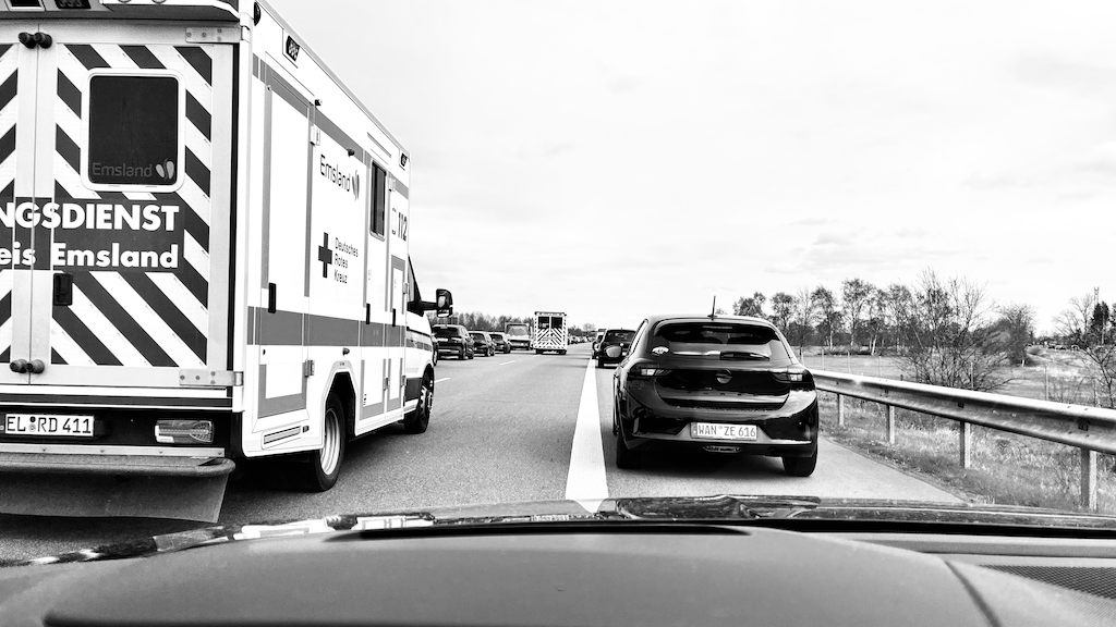 Stau wegen Unfall wegen Stau, Gedanken an das Fischbrötchen, leider keine Privatsfähre und auch kein Macbook.